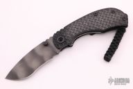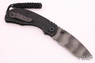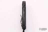 This RCC Linerlock by Strider features a tiger striped recurve blade with notched thumbrest and dual thumbstuds. The handle has double gunner grip black G-10 scales, titanium liner and a flamed tip up titanium clip. Nice detent, lockup and blade seating. Has a couple light scuffs, otherwise excellent condition.