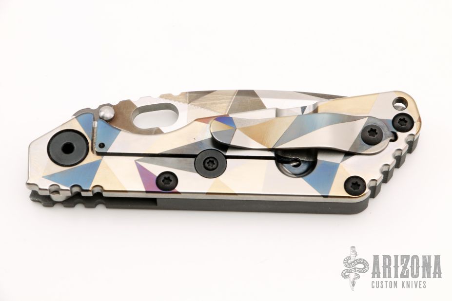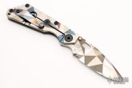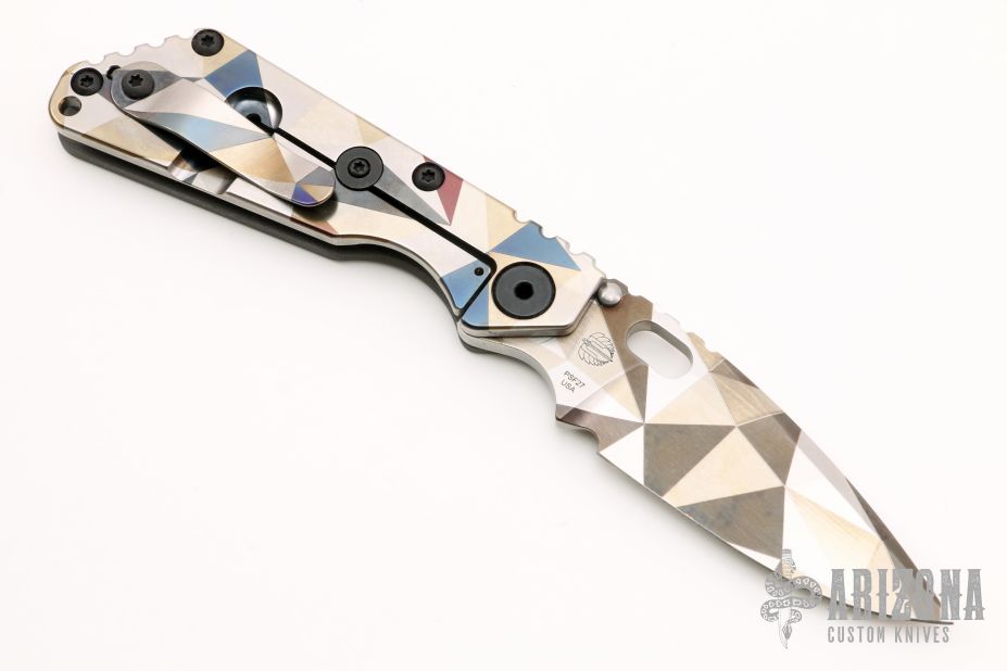 This SNG framelock folder by Mick Strider features a Battleship Camo spear point blade and a grey aluminum and Battleship Camo titanium frame and tip up titanium clip. Includes a "Lock Bar Stabilizer" for maximum reverse lock retention. Nice detent, lockup and blade seating. New condition.