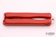 This Vintage CIA Balisong by Hackman has a satin finished stainless steel clip point blade. Handle is red polymer with O-latch at butt. Excellent condition.