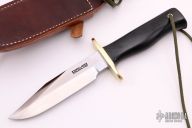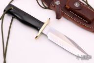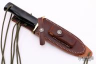 This Model 15-5.5 Airman by Randall Made Knives features a satin finished clip point blade with sharpened top edge, .217" blade stock and 1.233" blade depth, full tang construction. The handle is comprised of a nickel silver guard and black linen micarta grip. Brass lanyard tube with lanyard in pommel. Includes brown leather sheath with belt loop and sharpening stone, comes with original paper wrapping. New from maker.