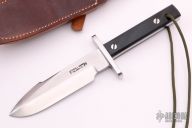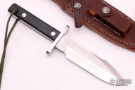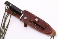 This Model 17 Astro by Randall features a satin finished spear point blade with false top edge, .230" blade stock. 1.389" blade depth, full tang construction. Black linen micarta scales, fastened with removable stainless steel bolts. A slot in the heavy tang and matching hollow inside the handle may be used to carry matches, fishhooks, line and other survival items. The Model 17 was especially designed for the seven Mercury astronauts, who carried them on America's first manned space flights. Astronaut Gordon Cooper did the final design, and two of these historically valuable knives are on display in the Smithsonian Institution. Includes brown leather sheath with stone. New from maker.