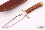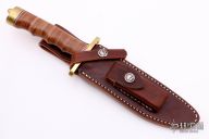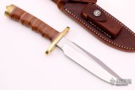 The Model 1 Fighter by Randall Made Knives has a stainless steel blade with sharpened top edge, .218" blade stock and 1.186" blade depth, hidden tang construction. The handle has a Model 18 brass double guard with thong holes, stacked leather finger grip handle with red/white/blue spacers, brass butt. Comes with a brown leather sheath. New from maker.