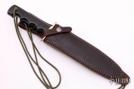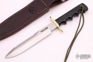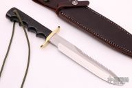 The Model 16-7 Diver was designed especially for heavy-duty salt water use and is as nearly indestructible as possible. This knife has a satin finished stainless steel blade with sawteeth, .219" blade stock and 1.152" blade depth, full tang construction. The handle has a double brass guard, and black linen micarta handle with a brass lanyard hole. Comes with a waxed brown leather sheath. New from maker.