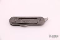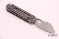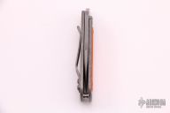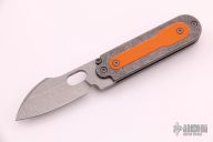 This midtech Bean folder by Serge Panchenko features a stonewashed, Nitro-V, sheepsfoot style blade with front flipper/friction bar and thumb hole. The handle is stonewashed titanium with a tip up clip and a orange G10 inlay.. Has a detent to hold the blade in position open/closed, but it does not lock. New from Mr. Panchenko.