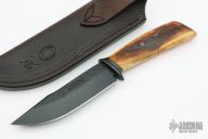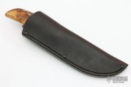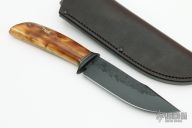 This Spear Point by James Behring features a blued and hammer marked blade with false top edge, .203" blade stock and 1.365" blade depth, hidden tang construction. The handle has a blued steel guard, artifact fossil walrus ivory grip with copper pin and black/copper spacers. Comes with a black leather sheath with belt loop by Warlander Leather. New from maker at the 2021 Blade Show.