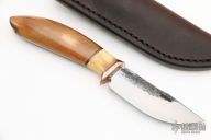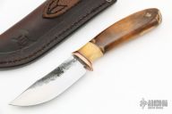 This Hunter by James Behring features a satin finished and hammer marked blade with false top edge, .129" blade stock and .925" blade depth, hidden tang construction. The handle has a copper guard, artifact fossil walrus ivory grip with black/copper/walrus ivory spacers. Comes with a black leather sheath with belt loop by Warlander Leather. New from maker at the 2021 Blade Show.