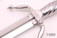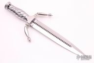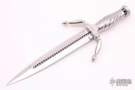 This Dagger by Jim Ence features a mirror polished double-edged blade with a cut out in the middle that holds ball bearings, the ball bearings disappear into the handle with the blade is pointed up. It has .226" blade stock and 1.408" blade depth, hidden tapered tang.  The handle is all mirror polished stainless steel, the butt unscrews and the balls can be removed. Comes with zippered case. Excellent condition.