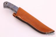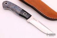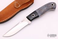 This small hunter by Mike Irie features a hand rubbed satin finish blade with notched thumbrest, .119" blade stock and .975" blade depth, full tang construction. The handle has black linen micarta bolsters and wood scales. Excellent fit and finish. Brown leather sheath. New from maker at the 2021 Blade Show.