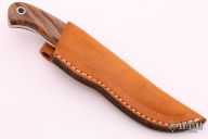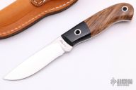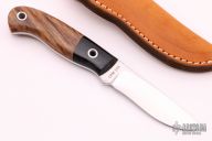 This small hunter by Mike Irie features a hand rubbed satin finish blade with notched thumbrest, .119" blade stock and .975" blade depth, full tang construction. The handle has black linen micarta bolsters and wood scales. Excellent fit and finish. Brown leather sheath. New from maker at the 2021 Blade Show.