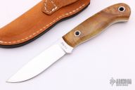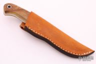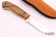 This small hunter by Mike Irie features a hand rubbed satin finish blade with notched thumbrest, .119" blade stock and .975" blade depth, full tang construction. The handle has wood scales. Excellent fit and finish. Brown leather sheath. New from maker at the 2021 Blade Show.