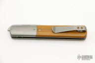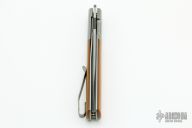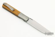This Barlow front flipper from Brad Zinker features a tumble finished blade with checkered thumbrest and flipper. The handle has dovetailed and tumble finished titanium bolsters, butterscotch linen micarta scales, tumble finished titanium liners with laser engraved interiors and tip up clip. Nice detent, lockup and blade seating, rides on bearings. New from maker at the 2021 Blade Show.