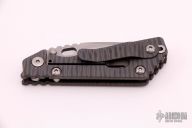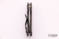 This PT by Mick Strider features a stonewashed blade with notched thumbrest and thumbhole. The handle has a flame finished titanium frame with matching tip up clip. New condition.