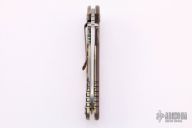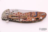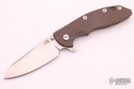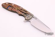 This Skinny XM-18 3.5" flipper by Rick Hinderer features a stonewashed blade with notched thumbrest and flipper. The handle has an anodized and laser engraved titanium frame with a brown G-10 scale, a tip up or down reversible titanium clip and filler tab, lanyard hole at the butt. Excellent condition. Comes with original box and extra hardware.