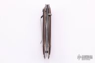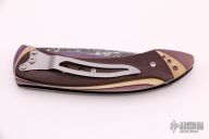 This Linerlock by Stephen Olszewski features a Damascus blade with single thumbstud. The handle has maroon linen micarta scales, anodized titanium liners and a tip down stainless steel clip. Nice detent, lockup and blade seating. Comes with a zippered case. Excellent condition.