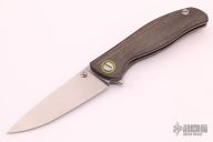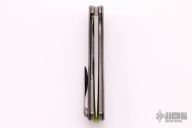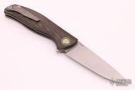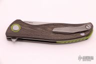 This F3 Flipper from Shirogorov has a stonewashed flat ground spear point blade with notched flipper. Handle has green canvas micarta scales, with titanium tip up clip and liners, green G-10 backspacer with recessed lanyard bail. Dead center blade seating, excellent detent and lockup, and flips superbly on single row bearings. Excellent condition.