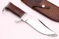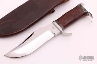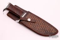 This Elmer Keith by DE Friedly features a mirror polished blade with false top edge and notched thumbrest, .370" blade stock and 1.765" blade depth, hidden tang construction. The handle has a stainless steel guard and butt, desert ironwood burl grip with black canvas micarta and nickel silver liners. Comes with a hand tooled brown leather sheath and Maxpedition zippered case. Excellent condition.