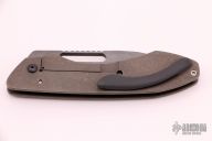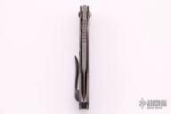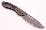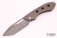 This one off framelock by Jeremy Marsh features an acid tumbled tanto blade with notched thumbrest and a thumbhole. The handle has an anodized and tumbled titanium frame, tip up zirconium clip with hidden screws and a zirconium barrel spacer. Nice detent, lockup and blade seating. Has some scuffs on the clip, otherwise excellent condition. Comes with a zippered case. Marked 3/2016 inside frame.