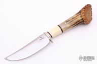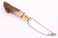 This Hunter from Charles Ochs features a mirror polished upswept blade with false top edge, hidden tang construction with .150" blade stock and 1.070" blade depth. The handle has a nickel silver guard, crown stag grip with black, burgundy and stag spacers. Includes a zippered case. Has a few light scratches, otherwise excellent condition.
