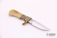This Miniature Pronghorn from Ed Fowler features a forged drop point blade with rounded spine, .122" blade stock and .427" blade depth, hidden tang construction. The handle has engraved brass guard and ram horn handle. Includes a nylon velcro case. Excellent condition. #1 on the blade.