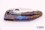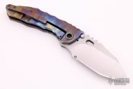 This Draco from Dalibor Bergam features a satin finished blade with notched thumbrest and thumbhole. The integral handle is comprised of sculpted, heat colored and orange peel finished titanium with a matching pocket clip positioned for tip up carry. The blade is centered when closed, opens/closes smoothly, and locks up with absolutely no play. Excellent condition. Comes with a zippered case and COA dated Feb 10, 2016.