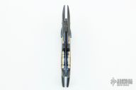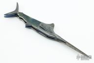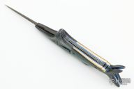 This Marlin/Swordfish Auto by Chuck Gedraitis features a Mike Norris Bent Lightning Stainless Damascus blade with false top edge. The handle has Random Pattern Damascus bolsters with carved gills, mouth and fins. One of the fins on the front bolster is the rocker bar. The scales are beautiful blue/green mammoth ivory, orange peel finished and anodized titanium liners, Damascus backspacer with filework. Nice action and lockup. Comes with a zippered case and COA. New from maker at the 2021 Blade Show. Winner of the "Best of the Rest" award. Comes with a copy of the October 2021 issue of "Blade Magazine" where it is featured on page 43.