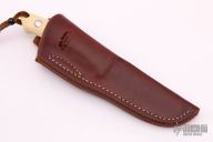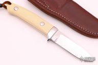 This knife by Bob Dozier features a hand ground mirror polished blade, .188" blade stock and .929" blade depth, full tapered tang construction. This knife was hand ground and made solely by Bob Dozier. The handle has a stainless steel guard, Westinghouse ivory paper micarta scales with red liners. Has lanyard hole at the butt. Comes with a brown leather sheath. New from maker at the 2021 Blade Show.