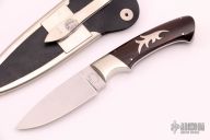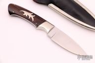 This Boot Knife by Jim Ence features a hand rub satin finished blade, nickel silver bolsters, and cocobolo scales with a nickel silver escutcheon, .180" blade stock and 1.102" blade depth, full tapered tang. Comes with a black leather and nickel silver boot sheath and a zippered case. Excellent condition.