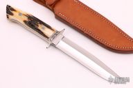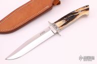 This Fighter by John Young features a mirror polished blade with 3" sharpened top edge, .180" blade stock and 1.104" blade depth, full tapered tang construction. The handle has a stainless steel guard and pins that have been masterfully engraved by Julie Warenski and has gold inlays, stag scales and thin red liners. Lanyard hole at butt. Comes with brown leather sheath and nylon zippered case. Excellent condition.