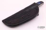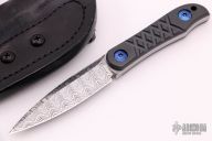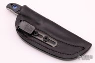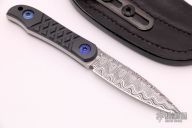 This knife by Sal Manaro features a Damasteel blade with false top edge and notched thumbrest, .190" blade stock and .764" blade depth, full tang construction. The handle has milled zirconium scales, anodized and milled titanium screws, lanyard hole, checkered tang at the butt. Comes with a black leather sheath with an UltiClip. Excellent condition.