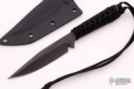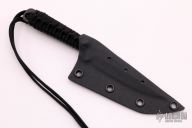 This knife by Mick Strider features a black blade with paracord wrap, .225" blade stock and .819" blade depth, full tang construction with cord wrapped handle. Comes with kydex sheath. New condition.