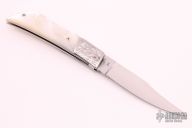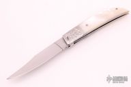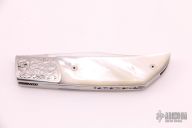 This Bolster Release Auto by Prinsloo (please let us know if you know who made this knife, or which Prinsloo it is, the knife is only marked with "28" on the ricasso) features a polished blade with notched thumbrest. The handle has engraved stainless steel dovetailed bolsters, mother-of-pearl scales, stainless steel liners and fileworked backspacer. Has some light scratches, otherwise excellent condition.