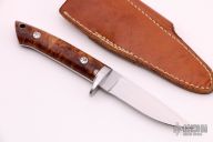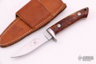 This small hunter by T.R Lewis features a satin finished blade with a tapered tang construction.  .118" Blade Stock.  .761" Blade Depth.  The handle features a steel guard and burl scales.  Includes a brown leather sheath.  Scuffs and scratches are visible on the blade/handle otherwise the knife is in fair condition.
