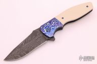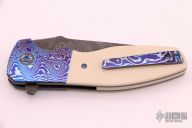 This Augustus Flipper by Kirby Lambert features a Damascus blade with notched thumbrest and flipper. The handle has mokuti bolsters, ivory paper micarta scales, bead blasted and anodized titanium liners, ivory paper micarta backspacer, and a tip up mokuti clip, anodized titanium hardware and copper pivot collars. Nice detent, lockup and blade seating, rides on bearings. Comes with nylon zippered case. Excellent condition.
