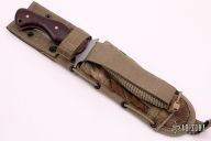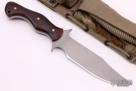 This "On Your Six" fighter with bead blast finished blade and integral double guard, full tang construction, .192" blade stock and 1.478" blade depth. Scales are dark stained Maple burl with copper pins. Comes with a camo nylon sheath. New from maker.
