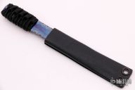 In 1988, he began making specialized knives for use by the military. This turned out to be fortunate turn of events, both for Mick and for the knife using world at large. Mick’s approach was to not get burdened by the weight of past designs. He started with a tabula rasa, a clean slate, informed only by his own experiences and knowledge of what a soldier needed in a knife. The knives he made didn’t look like the hunter-inspired knives seen in most PXs; instead they were almost brutish in their functionality: beefy, solid, and with unbreakable ¼” stock full tangs. These knives were the first indication of his innovative approach: in addition to their utilitarian design, the knives carried a subdued finish and subdued sheaths. No one carrying a Strider knife was going to be spotted because of sunlight glinting off of polished steel or a glossy leather sheath. Soldiers, policemen, and other men going into harm’s way couldn’t buy them fast enough. Mick sampled some good ideas, but made them great. For instance, he was not the first to wrap a knife handle with paracord, but he was the first to do it in a way that was tough enough for sustained infantry use. His knife line grew over the following years to include different varieties of fixed blades, all distinctive and many with specialized uses. But constant in all of them was a disregard for convention, and a desire to try new ideas. An example of this was the Ajax – it featured a very wide blade surface clearly designed to inflict damage. It drew on the weapons carried by Roman legionnaires, yet was modern and usable in the 21stCentury battlefield. Mick also worked on his technical skills, always striving to become better at the physical craft. At the 2002 Blade Show, a group of the best tactical knifemakers in the country decided to compete with each other to produce the most innovative and interesting fixed “battle blade” at the show. Mick’s entry, an incredible integral knife made out of ½” titanium stock with a zippered composite blade, gorgeous handles, and integral guard was the unanimous winner, and effectively retired the competition.