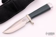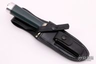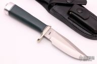 This MRS-4 by Martin Knives features a satin finished clip point blade with notched thumbrest, .205" blade stock and 1.267" blade depth, hidden tang construction. The handle has a nickel silver guard, green Tenite grip with black and aluminum spacers and an aluminum butt. Comes with black leather sheath. #07 on choil and back of sheath. Excellent condition.
