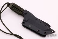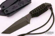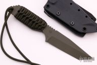 This DB-L from Strider Knives features a clip point tanto style blade with green cerakote and notched thumbrest, .250" blade stock and 1.307" blade depth, full tang construction. The handle has green paracord wrap. Comes with a kydex sheath. Excellent condition.