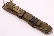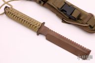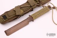 This ED CuBe EOD Knife by Strider features a copper beryllium blade with serrated spine, .274" blade stock and 1.294" blade depth, full tang construction with tan paracord wrapped handle. Comes with a nylon sheath. Excellent condition. This one is stamped "S30V" on the guard, but it is clearly Copper Beryllium.