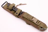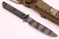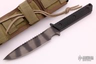 This MT Fixed Blade from Strider Knives features a tiger striped spear point blade with notched thumbrest, .251" blade stock and 1.302" blade depth. The handle has gunner grip black G-10 scales over full tang construction with a lanyard hole. Includes nylon sheath with belt loop. Excellent condition.