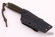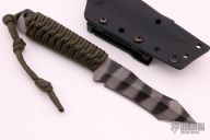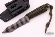 This WS Trisoula by Strider Knives features a tiger stripe finished recurve blade with large sharpened swedge, .246" blade stock and .999" blade depth, full tang construction. The handle has green paracord wrap. Comes with kydex sheath. Has some light scratches and sheath marks, otherwise excellent condition.