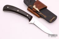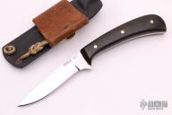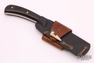 This custom knife by Keith Murr features a polished blade and a black linen micarta scales with red liners, .138" blade stock and .675" blade depth, full tang construction. Dated 1995. Has a kydex sheath with leather belt loop. Excellent condition.