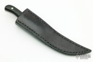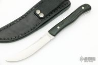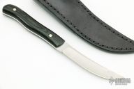 This fixed blade from Jeff Chaffee features a satin finish blade with notched thumbrest, .087" blade stock and .668" blade depth, full tang construction. The handle has black linen micarta scales. Excellent condition. Comes with a black leather sheath.