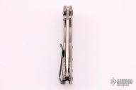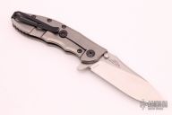 This Hinderer Designed 0562 Framelock Flipper has a drop/ spear point blade with swedge, notched thumb rest, dual thumb studs and flipper. Handle has a stonewashed titanium frame with stainless steel lockbar insert and lockbar stabilizer. Stainless steel clip is tip up. Includes original box and papers. Excellent condition. #2913