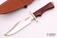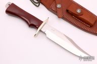 This Buxton Fighter by Randall Made Knives has a satin finished blade with sharpened clip, .224" blade stock and 1.350" blade depth, full tang construction. The handle has a nickel silver guard, red linen micarta handle. Comes with brown leather sheath. "BF 157" on blade. Excellent condition.