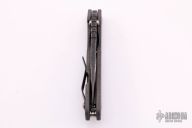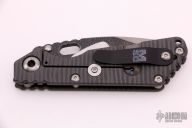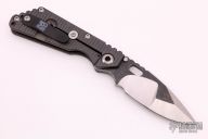 This SNG by Mick Strider features a nightmare dagger ground blade with a notched thumbrest and thumbhole and magma textured flats. The handle has a flame finished titanium frame, black tip up clip. New condition.