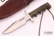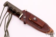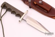 This Model 15 Airman by Randall Made Knives features a clip point blade with a sharpened top edge, .224" stock. 1.277" blade depth. Sharpened top edge, full tang construction. The handle has green linen micarta handle with finger grips and a nickel silver guard. The Model 15 is designed especially for heavy-duty use and to be as nearly indestructible as possible. Comes with a brown leather sheath and original paper wrapping. Excellent condition.