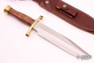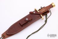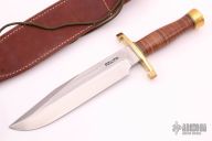 The Model 12-9 Sportsman Bowie by Randall Made Knives was made to meet the demand for a heavy-duty sporting knife of the Bowie type. This knife has a 9" blade with sharpened top edge, .222" blade stock and 1.759" blade depth, hidden tang construction. The handle has a lugged brass guard and brass butt, stacked leather grip with black/brass spacers. Comes with a brown leather sheath and original papers. Excellent condition.