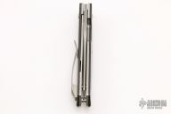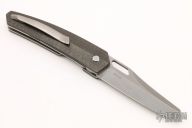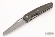 This Tangent by Richard Rogers features a bead blast finished blade with a thumbhole. The handle has contoured lightning strike carbon fiber scales, titanium liners and barrel spacers and a tip up anodized titanium clip with hidden screws. Knife has very smooth action, locks up with no play, and is centered when closed. Comes with a velcro case.  Light scuffs are visible on the blade and handle otherwise the knife is in Excellent condition.