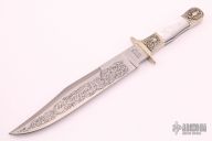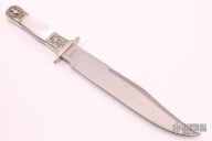 This Bowie by Parker-Edwards features a satin finished clip point blade with false top edge, .194" blade stock and 1.299" blade depth, full tang construction. The handle has a nickle silver guard  and bolsters, mother of pearl scales with black liners. Comes with original box. #525. Excellent condition.