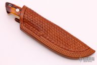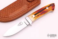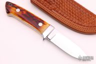This Drop Point Hunter by Gary Martindale features amazing stag scales with red liners and a mirror polished stainless steel guard. Full tapered tang construction with .187" blade stock and 1.086" blade depth. Mirror polished blade. Includes a hand tooled brown leather sheath with belt loop. Brand new from maker at the 2021 Blade Show. #138 on blade and sheath. Gary's knives are incredible and this one is no exception. Comes with a zippered case.